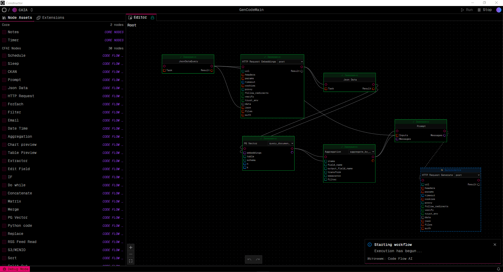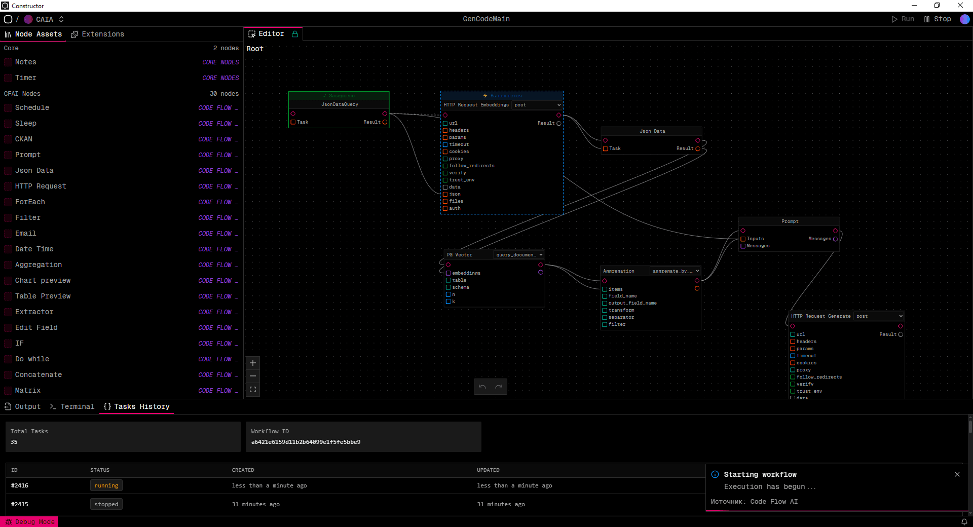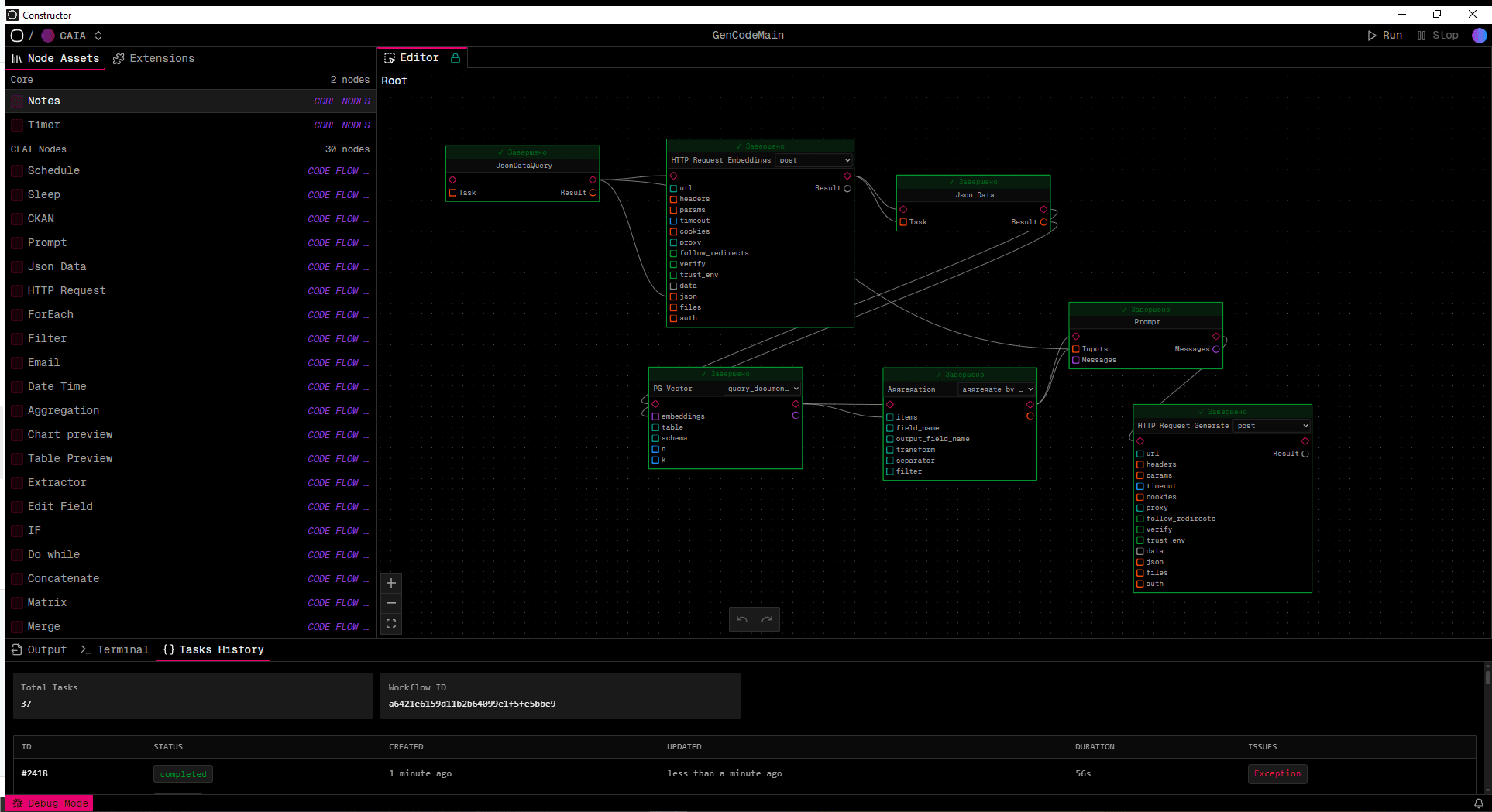 Система AI Constructor предоставляет визуальный интерфейс для создания рабочих процессов: