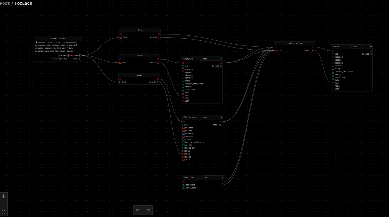 - Соедините RssFeedReadNode с ForEachNode